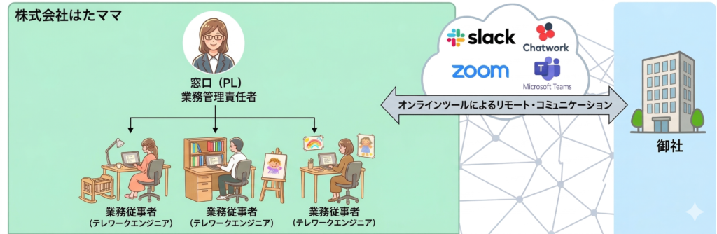 はたママエンジニアリングでは、お客様と弊社間で準委任契約(SES契約)を締結し、お客様専任担当スタッフ(チーム)がテレワークでお客様の業務を遂行させて頂きます。